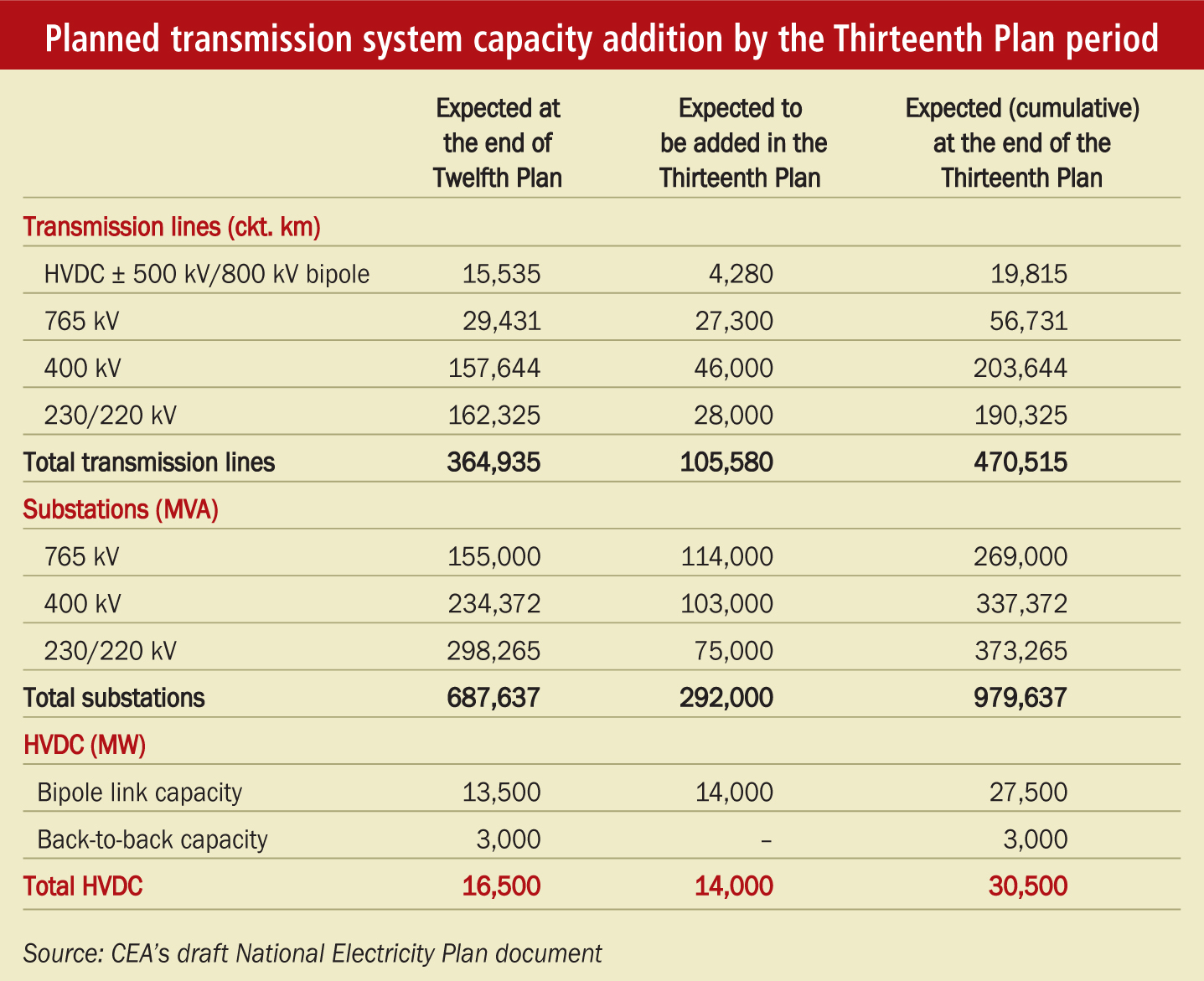 During the Twelfth Plan period, which will come to a close in March 2017, around 107,454 ckt. km and 287,836 MVA of transformer capacity is likely to be achieved. The total HVDC capacity proposed to be added during the Thirteenth Plan is expected to be around 14,000 MW, which would take the total capacity to 30,500 MW by the end of the plan period.