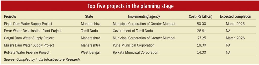 In Tamil Nadu, a total of six projects have been tracked which are at the planning stage. Key among these are the Rs 28.91 billion Perur water desalination plant project and the Rs 7 billion Kalapatti underground drainage project.