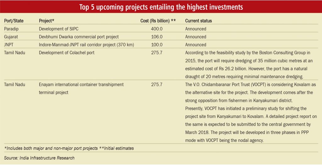 India Infrastructure Research tracked 87 projects (entailing an investment of more than Rs 5 billion each) in the Indian port sector, involving a combined investment of over Rs 3 trillion. Of these, three projects (Rs 68.34 billion) have been completed, 30 (Rs 716.97 billion) are under construction, 11 (Rs 215.63 billion) have been awarded but work is yet to start, and 43 (Rs 1,974.47 billion) have been announced but not yet awarded.