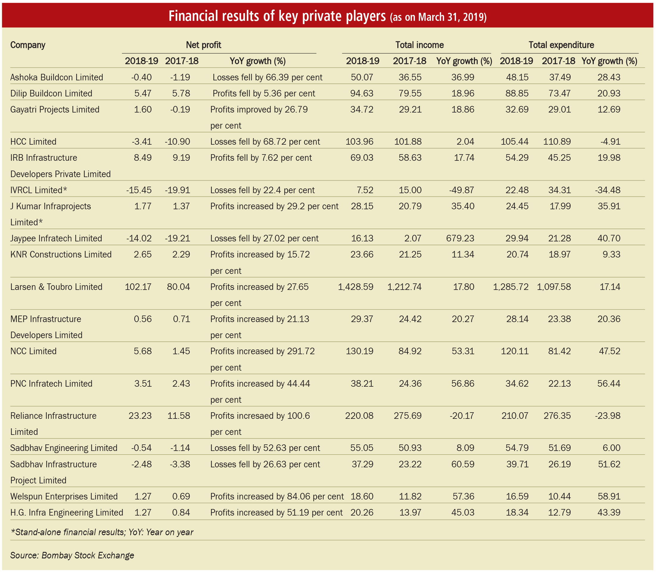 The year 2018-19 has been a mixed one for companies involved in road development. While those such as NCC Limited and Reliance Infrastructure Limited recorded sizeable profits, other large road construction players such as Ashoka Buildcon Limited, Hindustan Construction Company [HCC] Limited and the Sadbhav Group reported losses. The enormous construction opportunities offered by the Bharatmala Pariyojana and the new implementation models – hybrid annuity model (HAM) and toll-operate-transfer (TOT) – have attracted a number of new players. Mid-sized companies have started marking their presence, either on their own or through joint ventures with foreign companies.